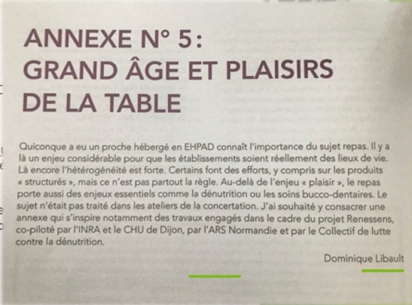 C’est avec beaucoup de satisfaction que parmi les 175 propositions de ce stimulant rapport nous avons découvert une annexe spécifiquement dédiée aux enjeux de l’alimentation des personnes âgées, du plaisir du goût et de la prévention de la dénutrition chez les personnes âgées. Annexe qui mentionne spécifiquement la contribution du collectif de lutte contre la dénutrition .